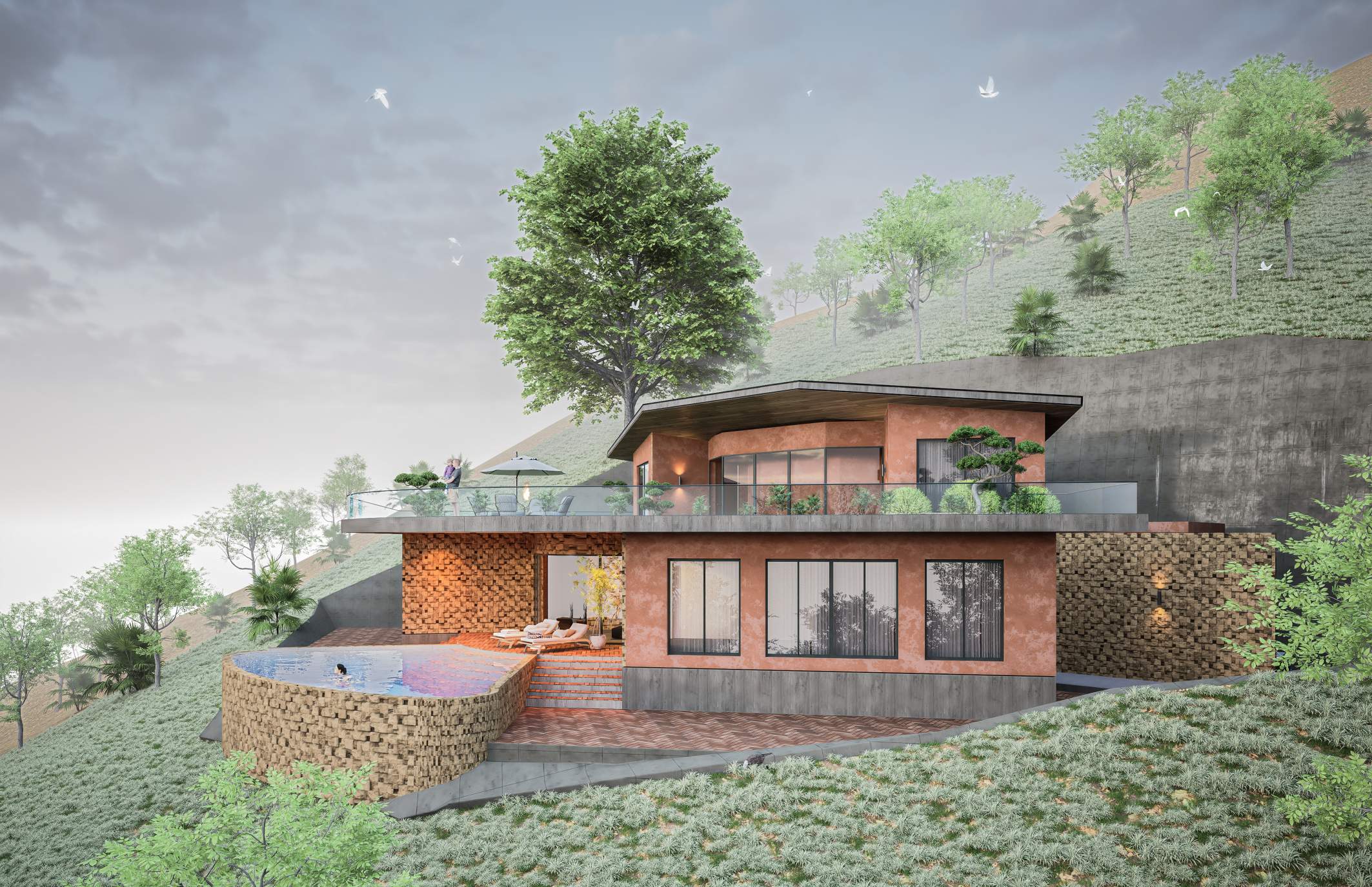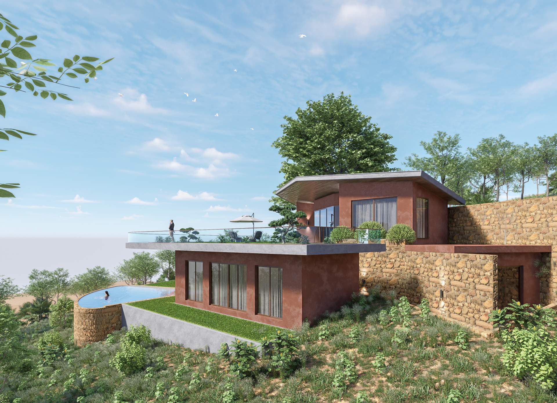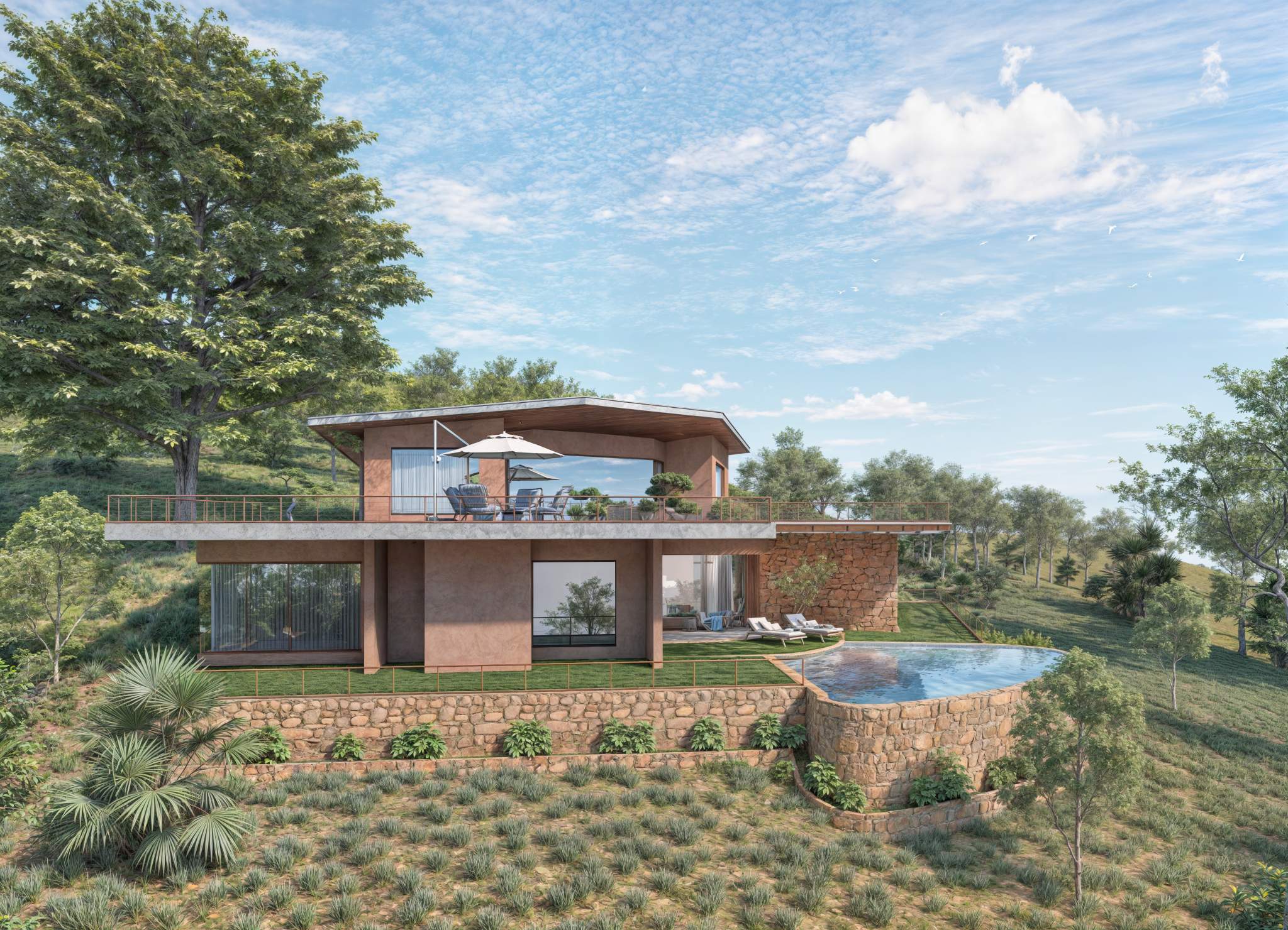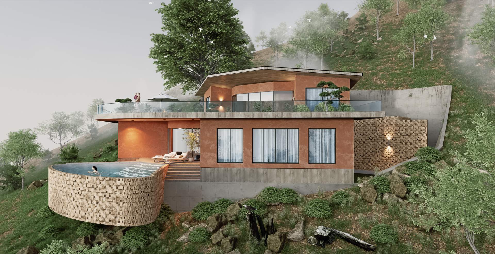 Nestled into the natural contours of a serene valley, this villa harmoniously blends with the terrain using earthy tones and a living green roof. Designed to celebrate the landscape, the structure opens fully to panoramic valley views, offering a seamless connection between architecture and nature. The home embodies sustainable design, minimal intervention, and immersive tranquility.