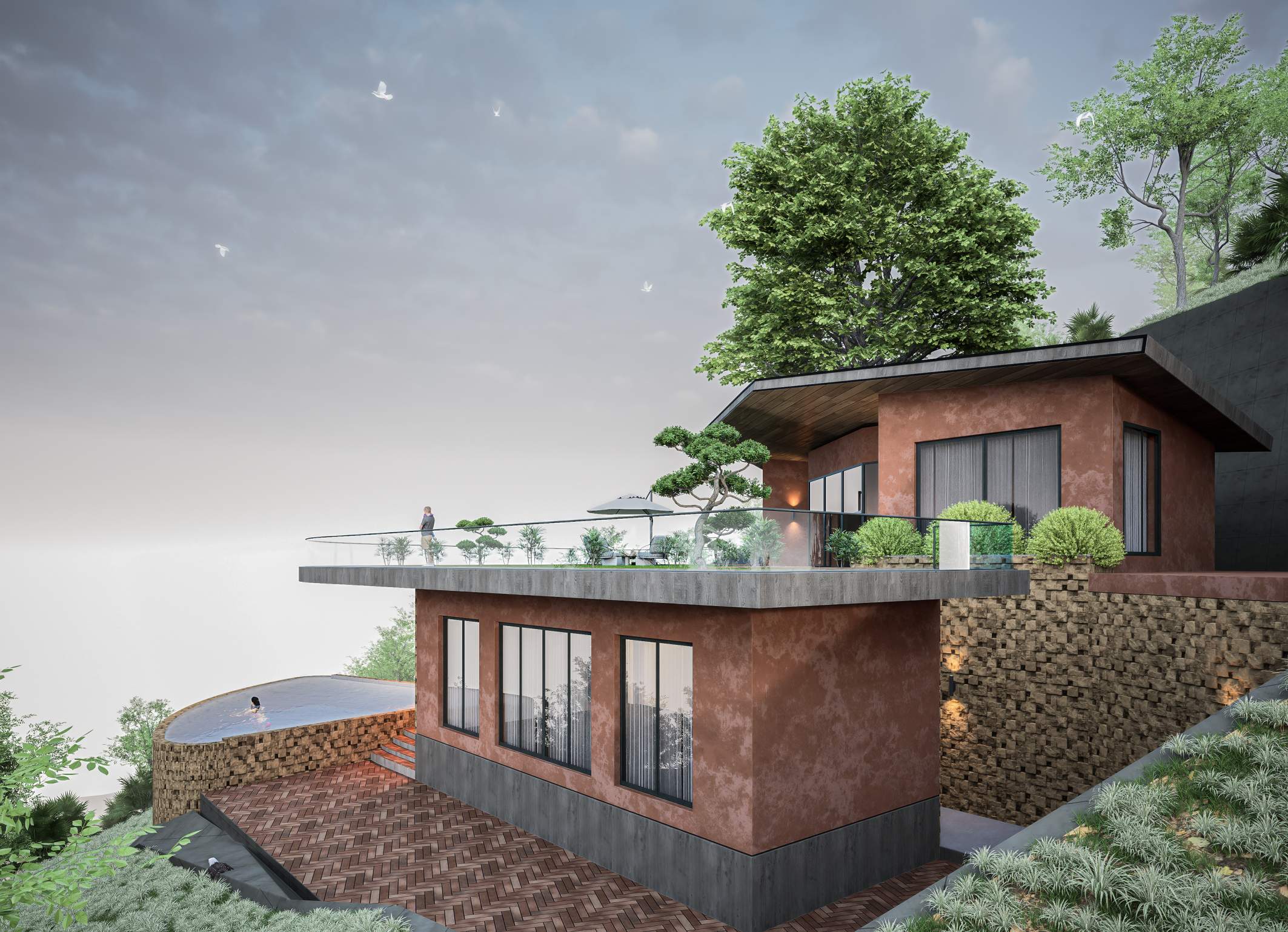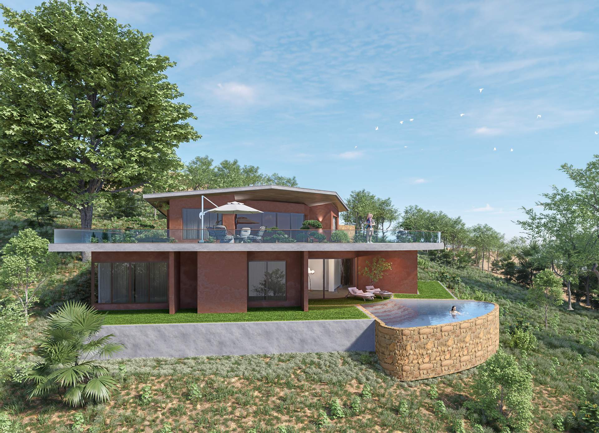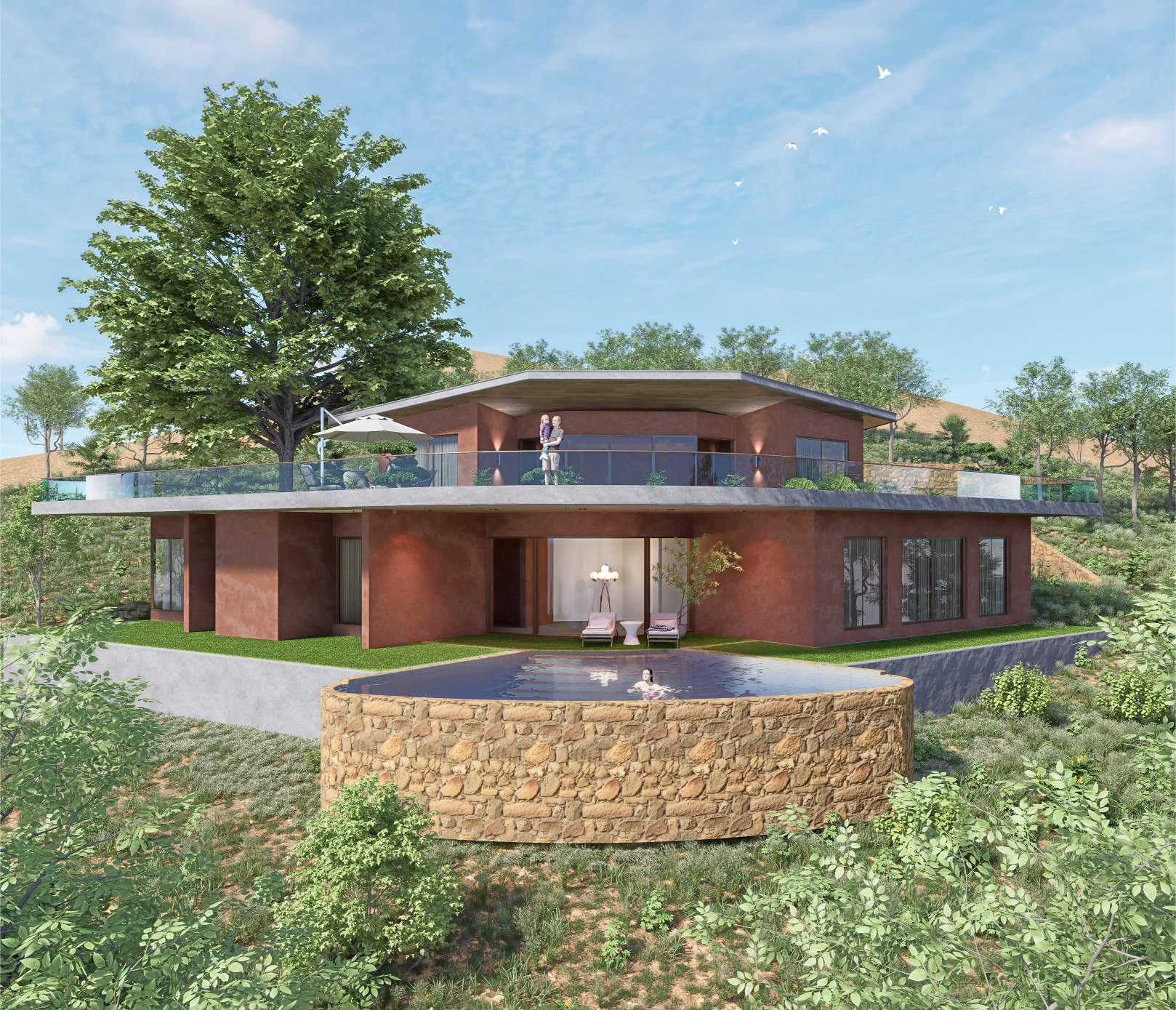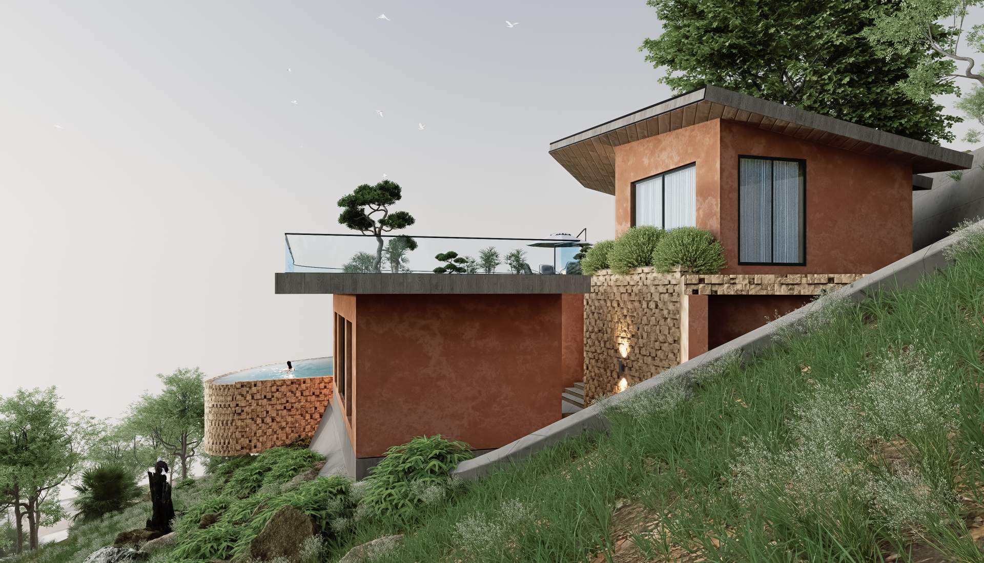 Nestled into the natural contours of a serene valley, this villa harmoniously blends with the terrain using earthy tones and a living green roof. Designed to celebrate the landscape, the structure opens fully to panoramic valley views, offering a seamless connection between architecture and nature. The home embodies sustainable design, minimal intervention, and immersive tranquility.